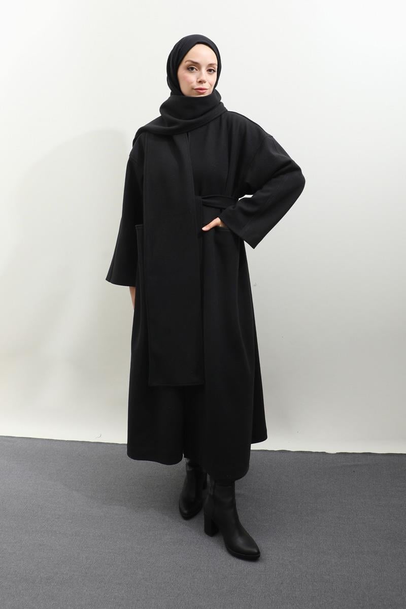 Atkılı Kaban Siyah. Düşük omuzludur. Önden cep detaylıdır. Atkı detaylıdır (Ayrıştırılabilir). Kuşaklıdır. Astarlıdır. Günlük kullanım ve özel günlerinizde tercih edebilirsiniz.