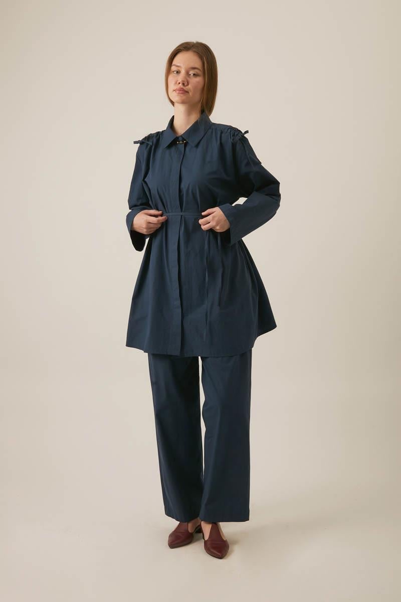 Omuzu Büzgü Detaylı Pantolon Takım Lacivert, Günlük giyiminizde şıklık ve konforu bir arada sunan bu poplin pantolon takımı, hafif ve nefes alabilen yapısıyla öne çıkar. Yüksek kaliteli pamuk poplin kumaştan üretilen bu takım, cilt dostu dokusuyla gün boyu rahatlık sağlar. Bol ve salaş kesimli üst, pratik bağlama detaylarıyla modern bir görünüm sunarken, uyumlu kesime sahip pantolon ile tamamlanır. Günlük hayatta rahat ve şık bir alternatif arayanlar için ideal bir seçenektir.