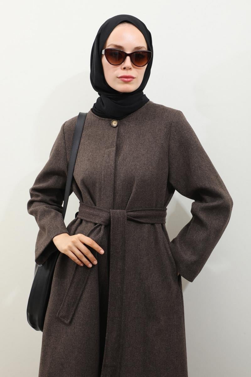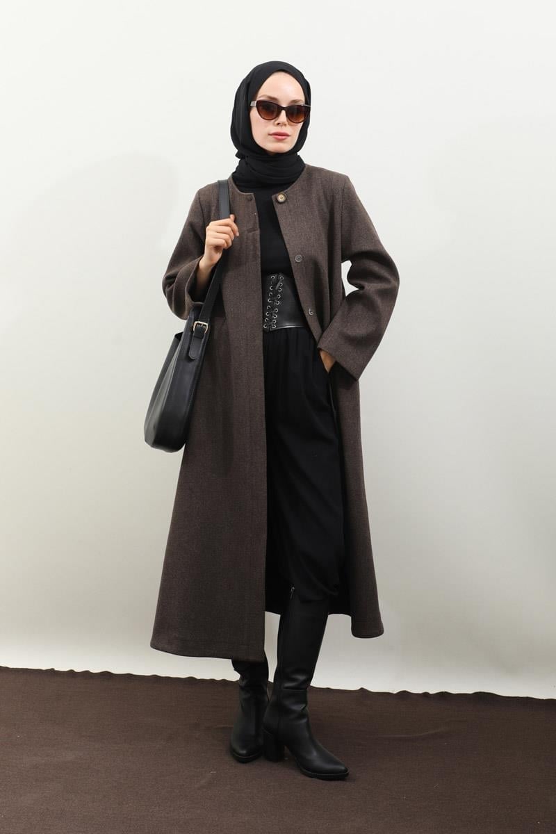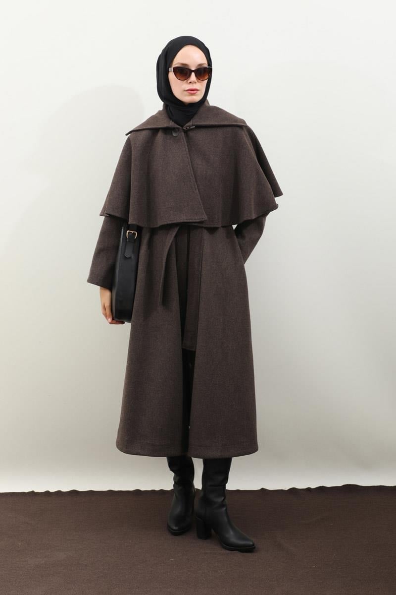 Pelerinli Kaban Kahverengi. Bisiklet yakalıdır, gizli düğmelidir, yandan gizli ceplidir, Kloş kesimdir, Astarlıdır, kuşaklıdır, Pelerin: Geniş yakalıdır önden çoban düğmelidir. Günlük kullanım ve özel günlerinizde tercih edebilirsiniz.